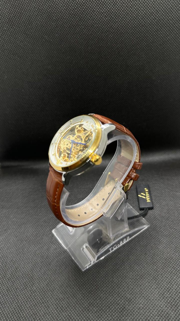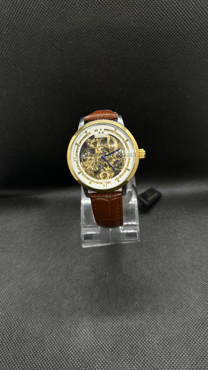Elegant Fitron automatic Skeleton Mechanical Watch with a golden skeleton dial, brown leather strap, and 42mm case. Features include shock resistance, waterproofing (30 ATM), and self-winding movement.